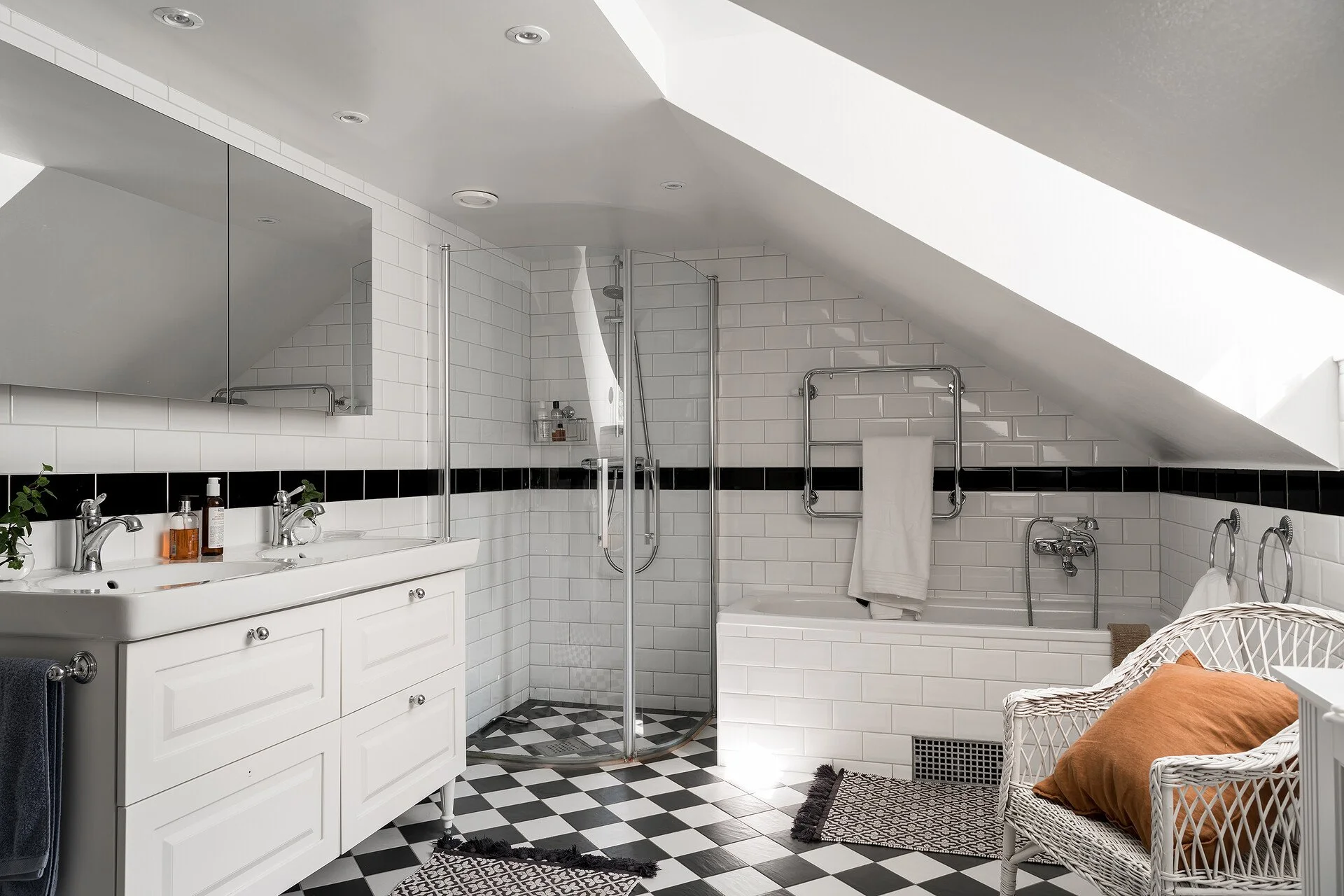 Jag hoppades kunna hitta gamla detaljer bakom gipsskivorna, men det mesta hade gått förlorat i tidigare renoveringar. En stor del av uppdraget har därför varit att återskapa gamla detaljer och samtidigt bygga något som känns nutida och funktionellt. Vi har jobbat med listverk, utformning på spegelpaneler, skeva vinklar och snedtak.